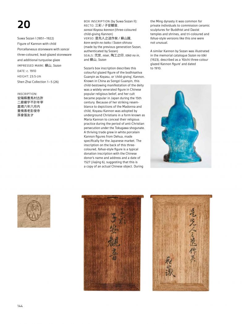 Выставка «Родственные души» демонстрирует необычайную красоту японской керамики в китайском стиле после середины 19 века. На протяжении более десяти веков китайской керамикой восхищались и подражали в Японии. В данной публикации впервые рассматривается вопрос о том, как развивались эти художественные отношения в эпоху Мэйдзи, Тайсё и начала эпохи Сёва. Подборка из 100 работ из знаменитой коллекции Shen Zhai демонстрирует разнообразие и качество этой керамики, от элегантного селадона до изысканного синего фарфора под глазурью. С подробными описаниями, клеймами мастера и надписями на деревянных ящиках эта книга становится ценным справочным пособием для коллекционеров и искусствоведов.