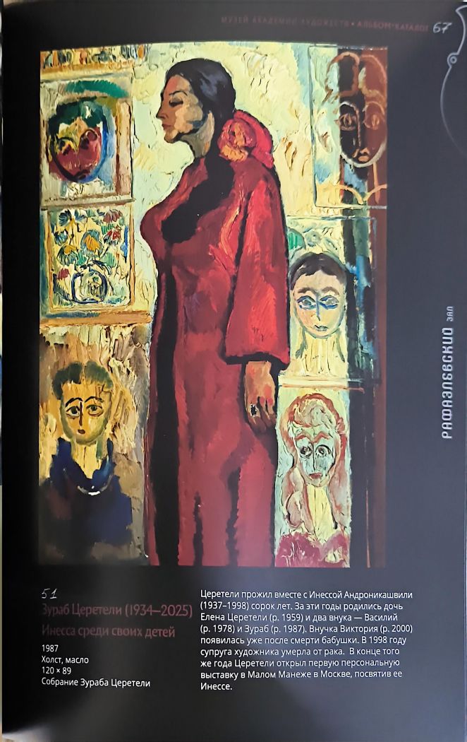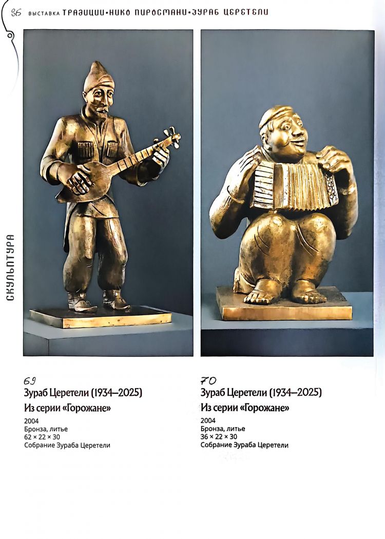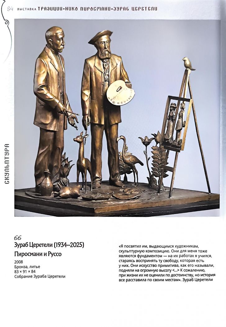 "Альбом-каталог выставки «Традиции. Нико Пиросмани. Зураб Церетели» демонстрирует зрителю преемственность наследия двух всемирно известных уроженцев Грузии-Нико Пиросмани (1862(?)-1918) и Зураба Церетели (1934-2025). При всем различии жизненного и профессионального путей в произведениях Пиросмани и Церетели отчетливо видны традиции народного грузинского искусства и общеевропейской художественной культуры. Творчество обоих мастеров отличает фольклорная эпичность образов, суровость и обобщенность форм, жажда самовыражения, неограниченная фантазия и внешняя простота, за которой скрывается глубина содержания."
